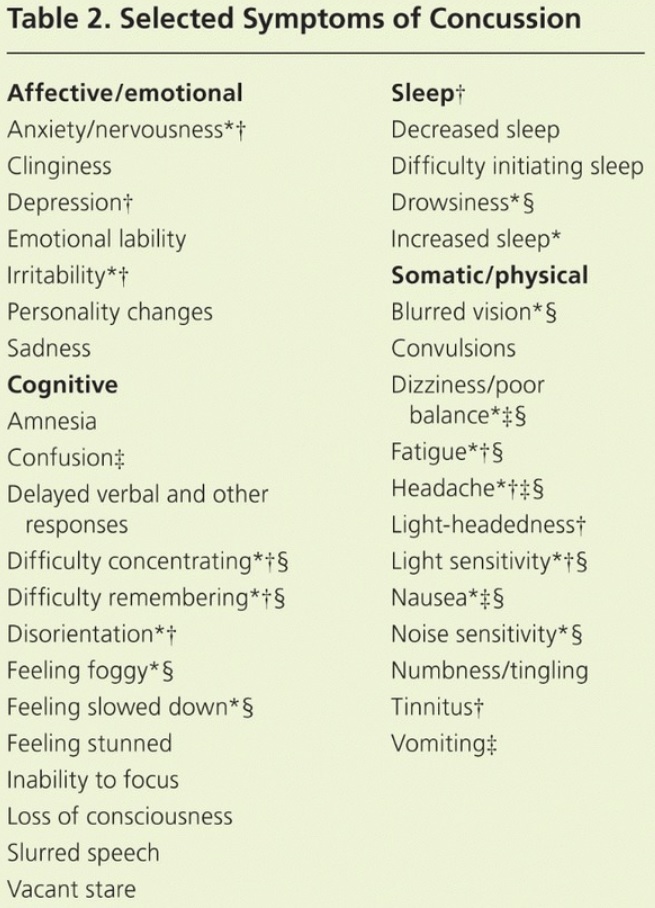 9) Look for other signs and symptoms of concussion. Nausea and vomiting are concerning symptoms of brain swelling and should prompt immediately calling 911. Seizures require immediate evaluation as well. These red flag symptoms may indicate a brain bleed, so do not delay care! At the bottom of this post, I am including a table with symptoms of a concussion. Please watch for all of these things! If multiple of these symptoms are present due more than 15 minutes after the injury, it is important to seek medical care.